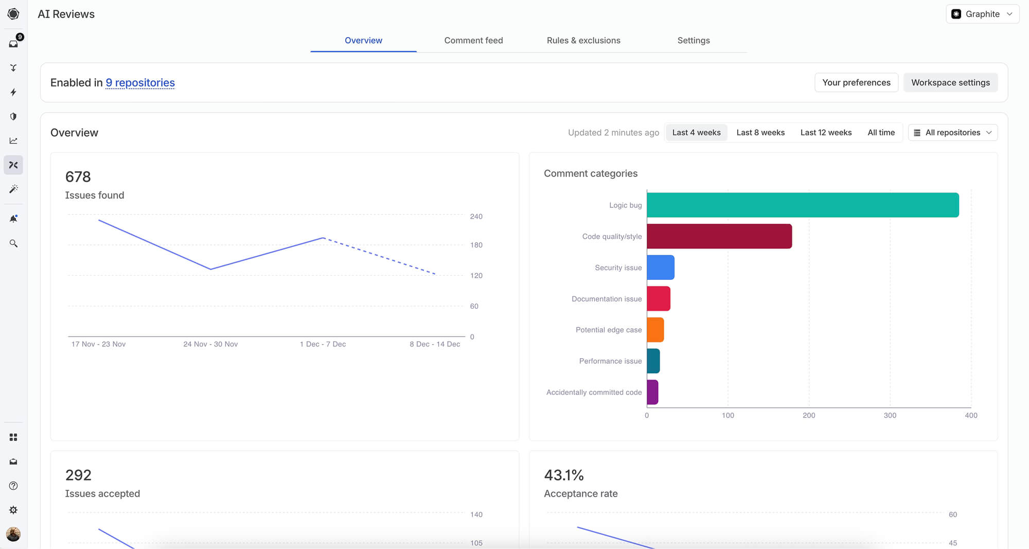 Acceptance rate tracks comments that result in developer action. When a developer sees a Diamond comment and commits the suggested change, this signals that the feedback was both accurate and valuable. Graphite considers this their most important metric because it directly measures whether comments are actionable and relevant.